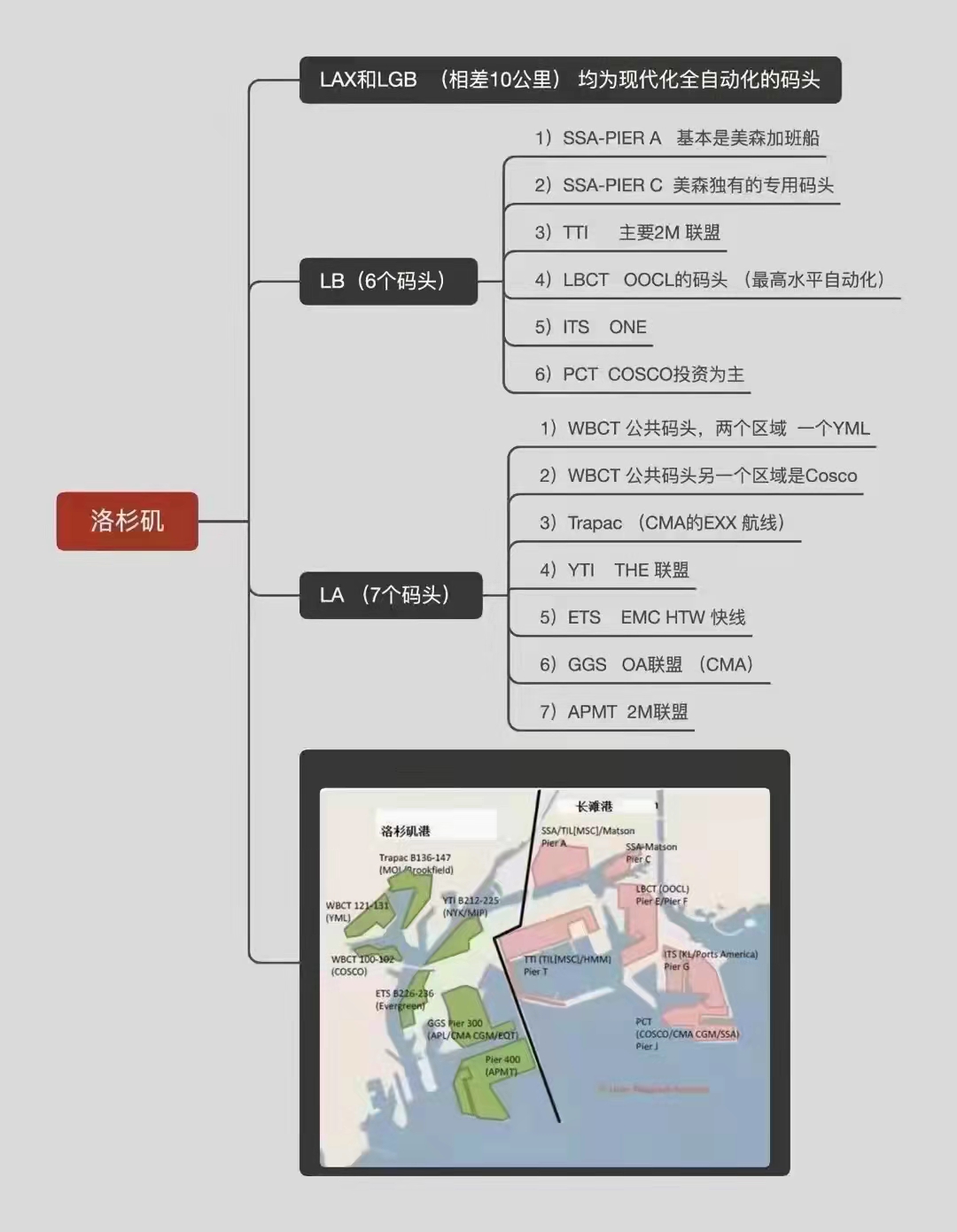 洛杉磯分為兩個港口,LA和LB 港口,這兩個港口相差10公里,和鹽田,蛇口港口一樣的。總共是13個碼頭,LB是6個碼頭,LA是7個碼頭