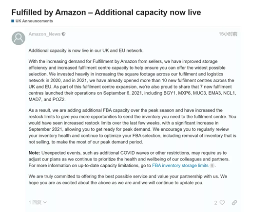 近期亞馬遜在后臺(tái)發(fā)布公告稱將會(huì)逐步開放庫存限制!讓賣家在旺季期間有更多機(jī)會(huì)將庫存發(fā)往FBA倉庫。