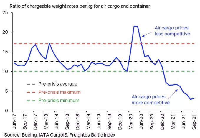 國際航空運(yùn)輸協(xié)會(International air Transport Association)和業(yè)內(nèi)專家表示,疫情前,空運(yùn)貨物的平均價(jià)格大約是海運(yùn)的13~15倍,但現(xiàn)在只比海運(yùn)貴3~5倍。
