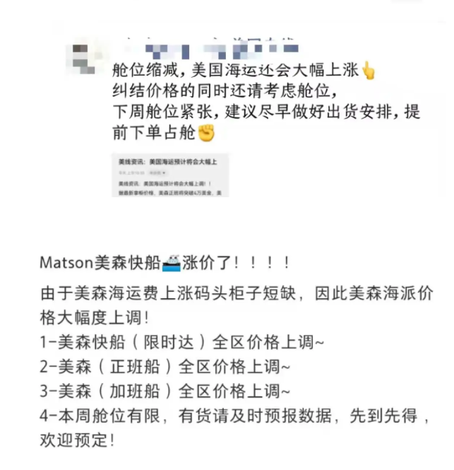 據(jù)貨代通知:美森價(jià)格再次兇猛反彈,根據(jù)最新拿柜價(jià)格,美森正班船將突破4萬(wàn)美元,美森加班船以及達(dá)飛EX1、EXX將突破2.6美元,而普船可能達(dá)至2萬(wàn)美元。