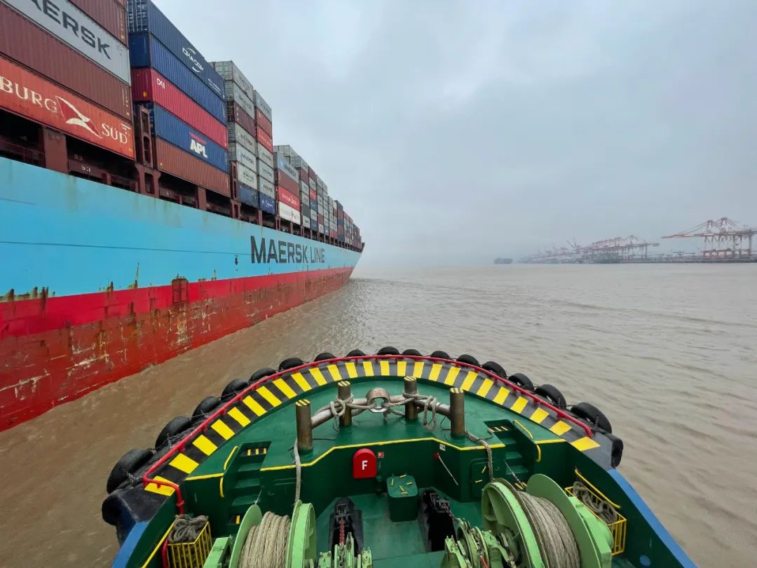 當海港拖輪啟航后,并沒有想象中的顛簸。穩穩地迎著風,一路駛向遠處即將進港的大船。這次,它任務是幫助一艘337米的馬士基大船靠泊碼頭。對于船長300米以上的大船,通常需要三艘拖輪共同作業,所以一同出發的還有兩艘拖輪,一頭一尾。