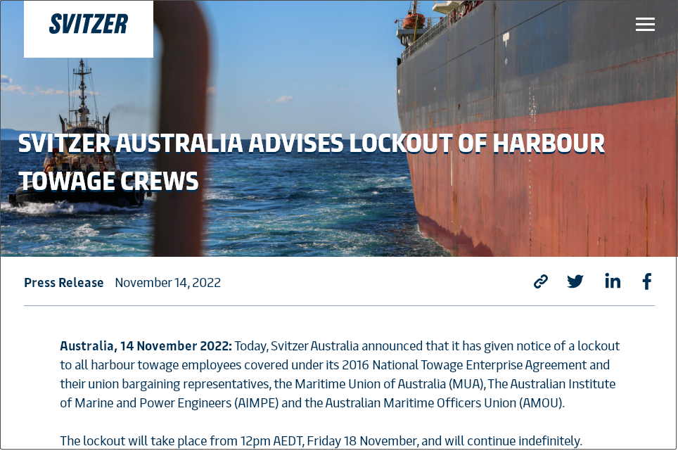 Svitzer他說,自2019年協議到期以來,他已經與海事工會進行了三年多的談判。自2020年10月以來,海事工會通知了1100多次罷工。自2022年10月26日以來,罷工行動仍然頻繁,工會幾乎每天都會通知新的受保護的罷工行動。