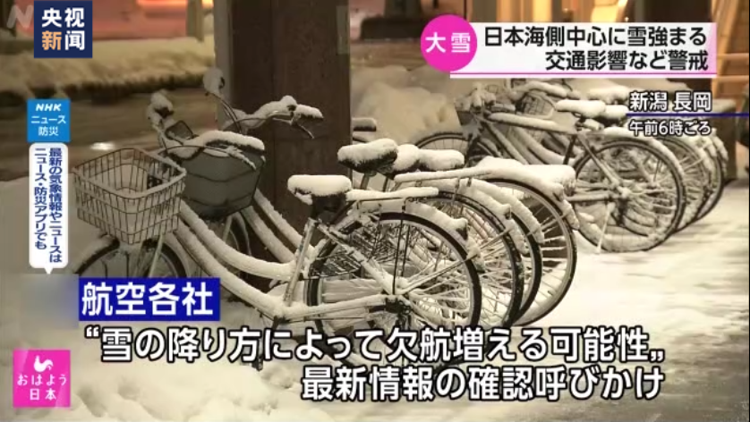 受冬季氣壓分布和冷空氣持續影響,日本17日以來多次下雪,當地積雪厚度超過1.6米。根據政府部門的數據,截至25日9時,大雪造成14人死亡,80多人受傷。在一些地區,成千上萬的家庭停電,許多鐵路停運,許多航班延誤。