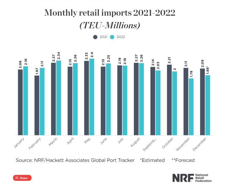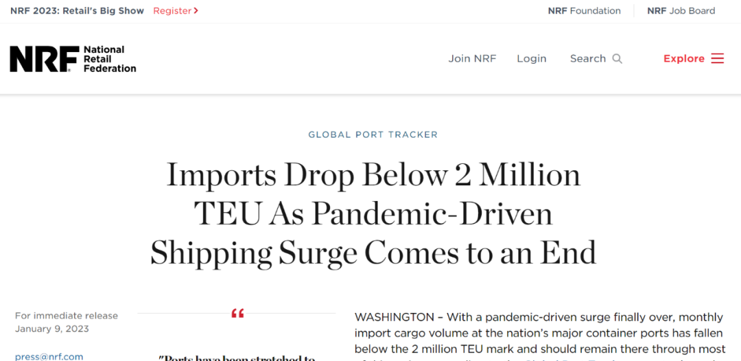 例如,根據美國全國零售聯合會的市場,(NationalRetailFederation,NRF)關于美國海上進口的最新數據估計,12月份的進口量比去年同期下降了10%(188萬標箱),預計到今年5月份,進口量將繼續低于2021年2022年同期水平。