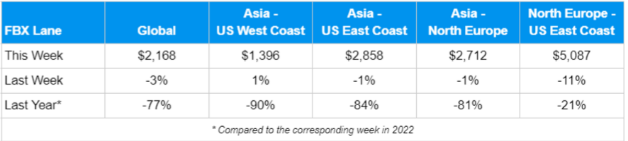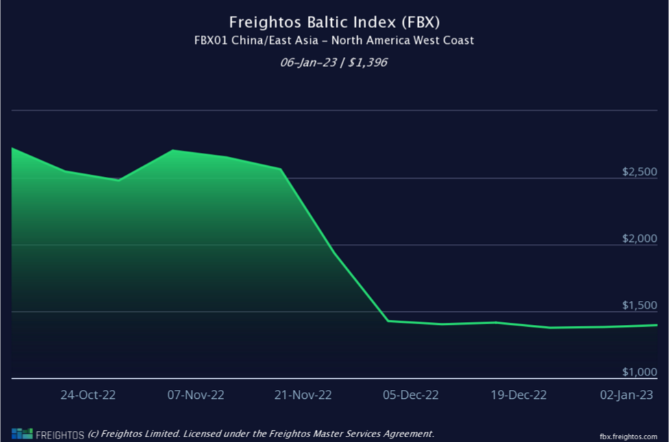 Freightos根據信德海事網提供的最新周報(12日)數據,本周亞洲-美國西海岸集裝箱運價周平均運價(FBX01Weekly)盡管增長了1%,但只有1396美元/美元。FEU。與去年同期相比,這種運價水平下降了90%。